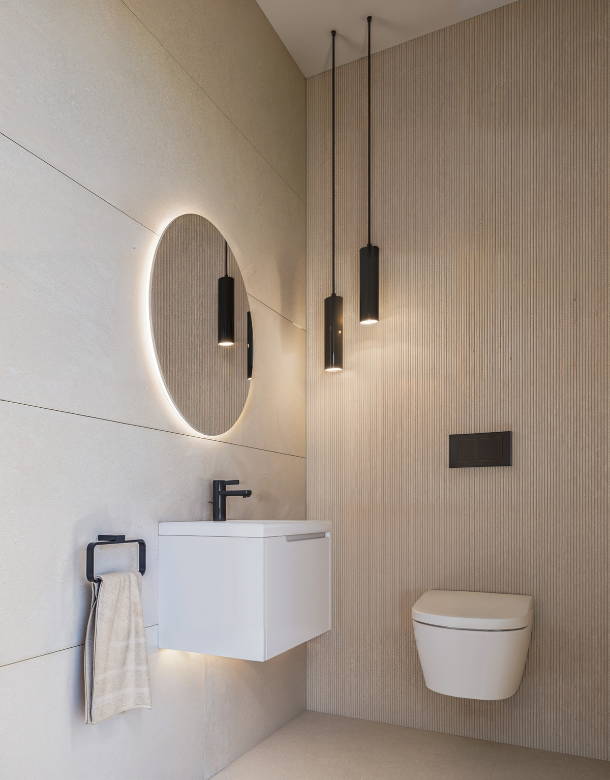 La salle de bains attenante à la deuxième chambre est dotée d'équipements ultramodernes et d'une esthétique contemporaine raffinée. Carrelage en porcelaine pleine hauteur du sol au plafond et douche minimaliste avec paroi de douche en verre. Vasque intégrée sur plan de travail avec meuble vasque deux tiroirs haut de gamme (disponible en finition couleur ou imitation bois) et miroir rétroéclairé alliant fonctionnalité et style.