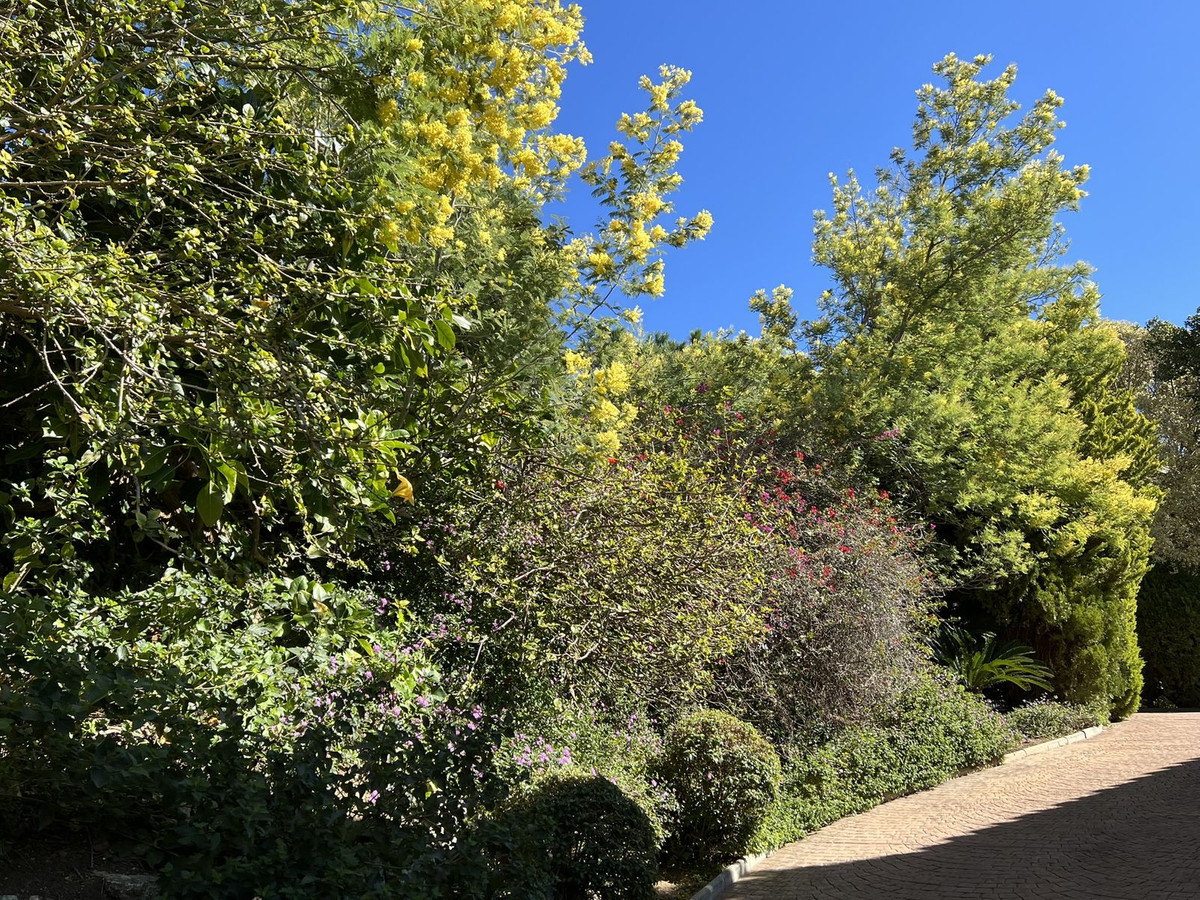 Jardin paysager mature avec arbres fruitiers, palmiers, jacarandas et magnifiques rocailles, arrosage automatique et éclairage nocturne abondant. Terrain facile d'entretien.