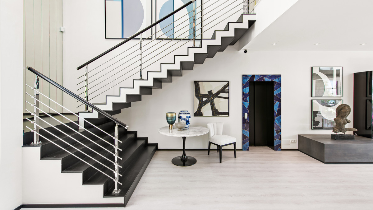 La propriété est répartie sur 4 niveaux reliés par un ascenseur et un escalier ultramoderne. Elle comprend 4 chambres et 4 salles de bains privatives, toutes équipées d'une baignoire hydromassage et d'une douche séparée, ainsi qu'un WC invités, un vaste séjour et une cuisine entièrement équipée en noir et blanc avec îlot central/coin repas et accès à une terrasse pour les repas en plein air.