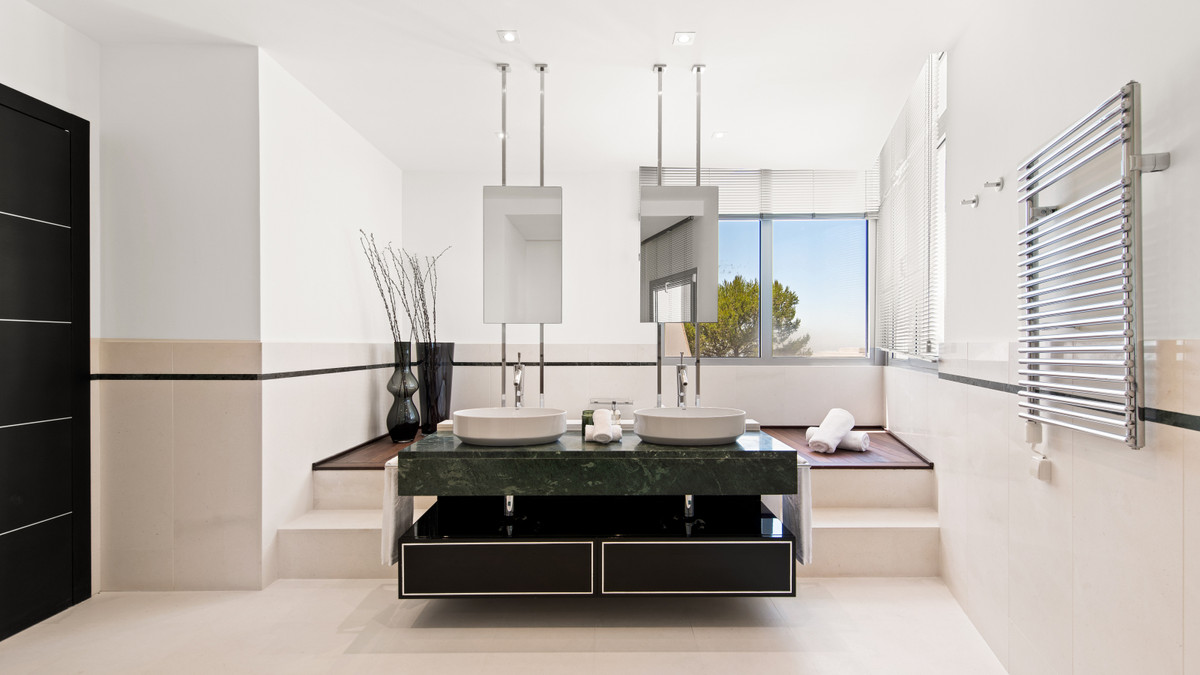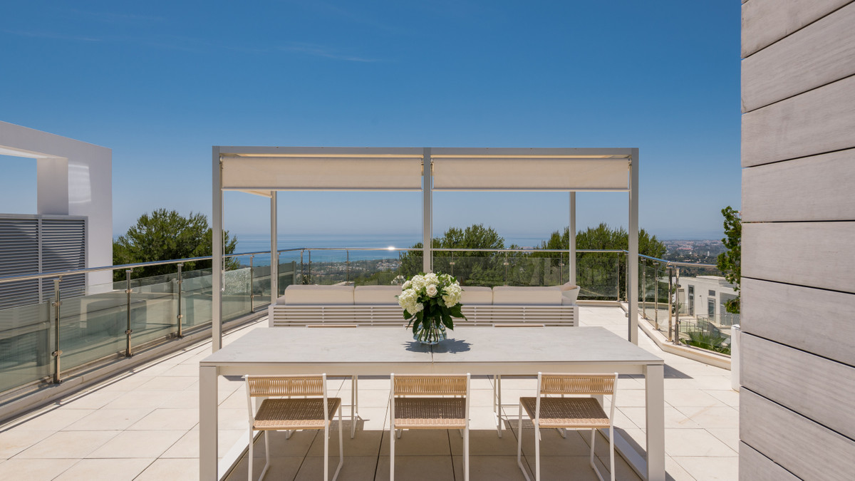 Cette luxueuse maison moderne à vendre au cœur de la Sierra Blanca est située dans le complexe résidentiel le plus exclusif, Meisho Hills, construit sur un terrain de 33 500 m² en 2012. Le complexe compte un total de 58 villas jumelées, dont cette villa d'angle unique, qui offre une vue imprenable sur la ville de Marbella, la mer Méditerranée, Gibraltar et la chaîne de montagnes marocaine.