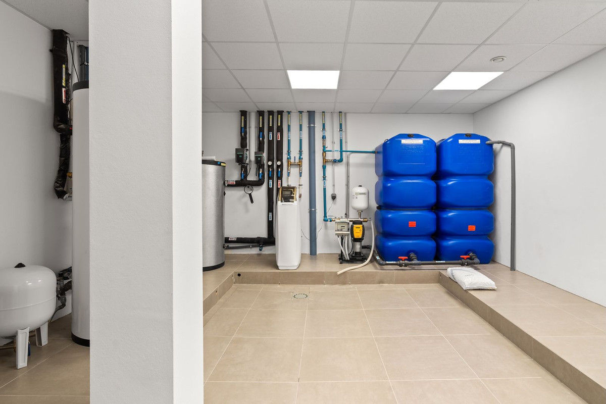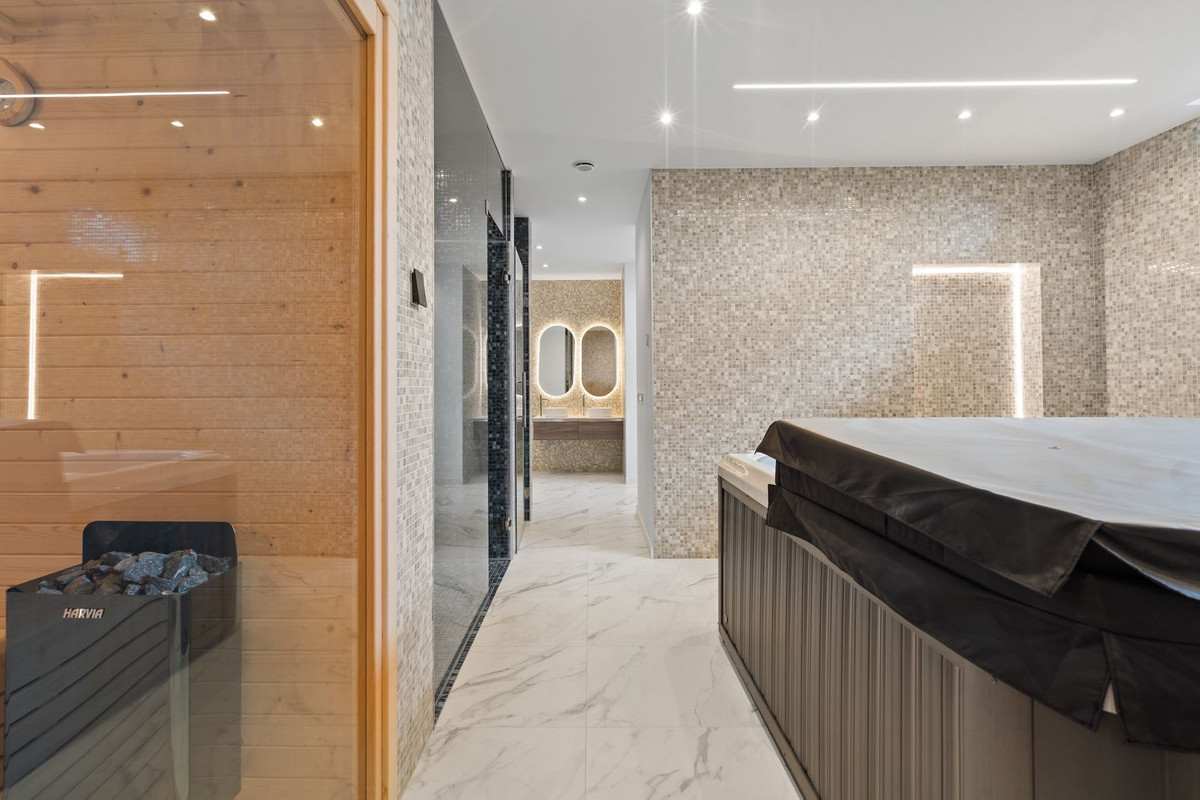 Le niveau inférieur est dédié au confort et aux loisirs, avec une salle de sport privée et un espace spa comprenant sauna, jacuzzi et hammam, ainsi que des espaces de divertissement, des logements pour le personnel, des rangements et des locaux techniques. La villa est équipée d'un chauffage au sol, d'une climatisation performante, de double vitrage et d'une cheminée. Son efficacité énergétique est optimisée grâce à des panneaux solaires photovoltaïques avec système de batteries FVE et un chauffe-eau solaire.