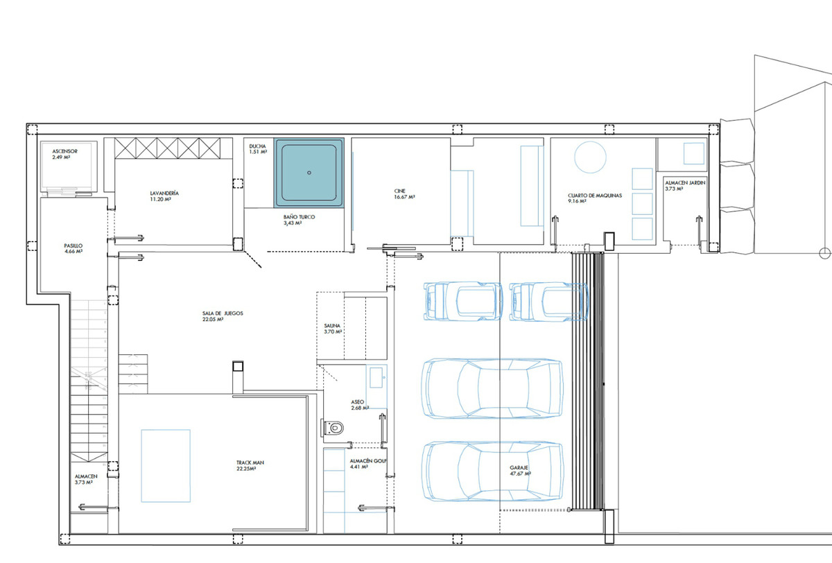 Le niveau inférieur est dédié aux loisirs et au bien-être, avec notamment une pré-installation pour un simulateur de golf Trackman, un sauna, un bassin d'eau froide, une buanderie entièrement équipée et de nombreux rangements. Le garage peut accueillir trois voitures et comprend des locaux techniques et de stockage supplémentaires.