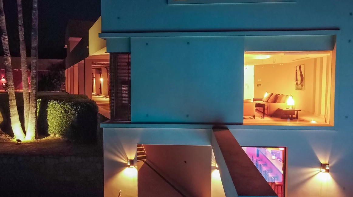 Les pièces principales, décorées avec les plus beaux meubles Georgetti et la cuisine, ont toutes accès à l'extérieur avec certaines zones aux couleurs fortes propres à Barragan. Des murs lumineux accentuent l'espace sur les terrasses près de l'étang de Koi et de l'espace barbecue extérieur protégé du soleil, qui se connecte à un jardin sur deux niveaux avec une fontaine et un mur de couleur vive, protégé du vent et offrant une intimité totale. La piscine à débordement avec sa superbe mosaïque Siccis, sa terrasse en bois IPE et sa cabane de style mexicain. La partie de style la plus spectaculaire de ce manoir est le spacieux espace de vie extérieur avec toit en verre et volets électriques en treillis sculpté qui jouent avec la qualité toujours changeante de la lumière et de l'ombre du toit et de la partie avant séparant le jardin sans enlever la vue sur la mer.