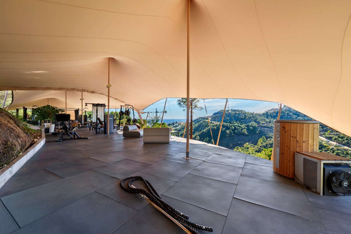 Cette villa de cinq chambres à coucher, située à El Madroñal, Benahavís, offre cinq salles de bains et un vestiaire. Le premier étage est dédié à la suite parentale avec dressing et bibliothèque, ainsi qu'à une salle de bains privative pour les invités. Le rez-de-chaussée s'articule autour d'espaces de vie formels et informels, d'une salle à manger, d'une cuisine, d'une cave à vin et d'une suite d'invités donnant sur une terrasse et une piscine à débordement chauffée au sel marin. Un niveau inférieur abrite un garage et un bureau. La propriété se dresse sur un vaste terrain offrant une vue panoramique et comprend une salle de sport extérieure entièrement équipée avec appareils professionnels et ring de boxe. L'architecture, partiellement intégrée à la montagne, crée un environnement naturellement climatisé, complété par un chauffage au sol dans toute la maison et un système domotique complet assurant confort et sécurité.