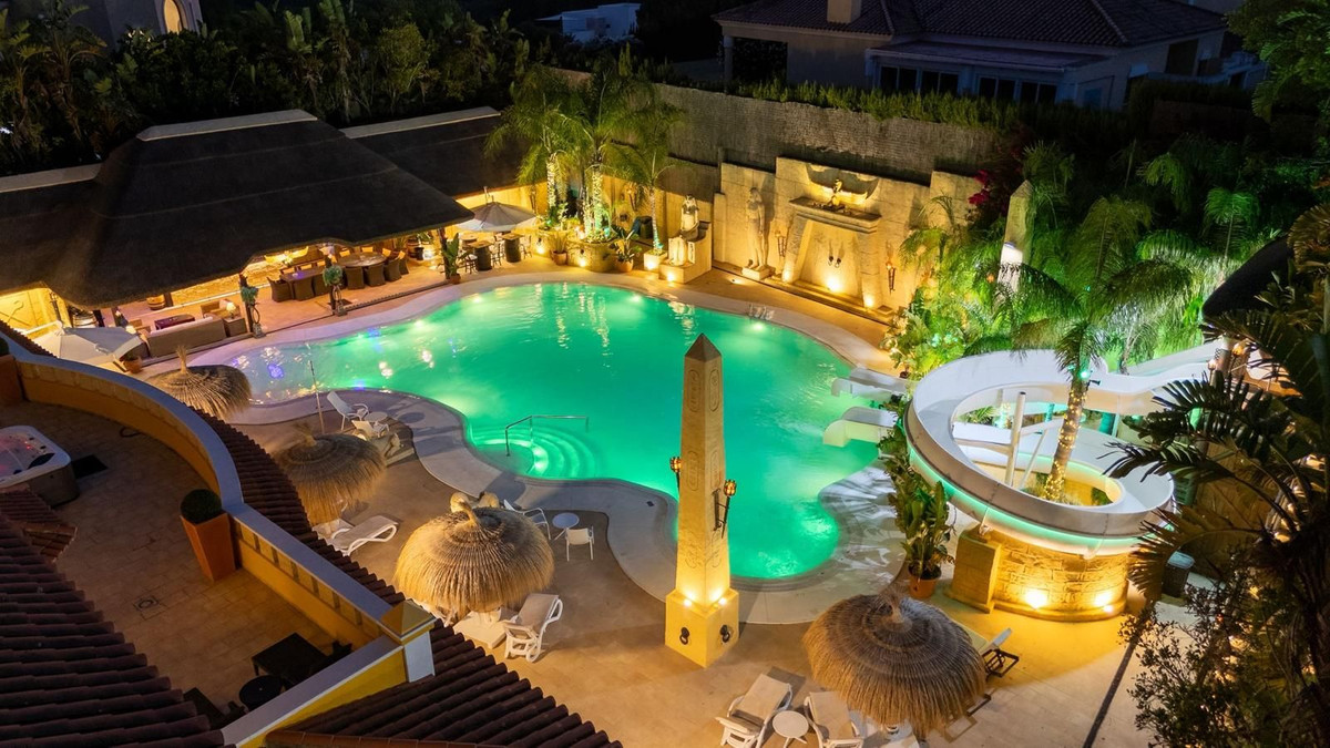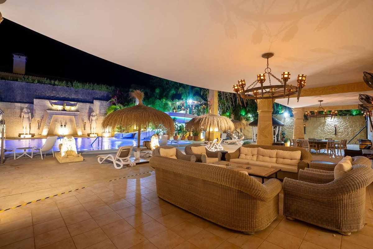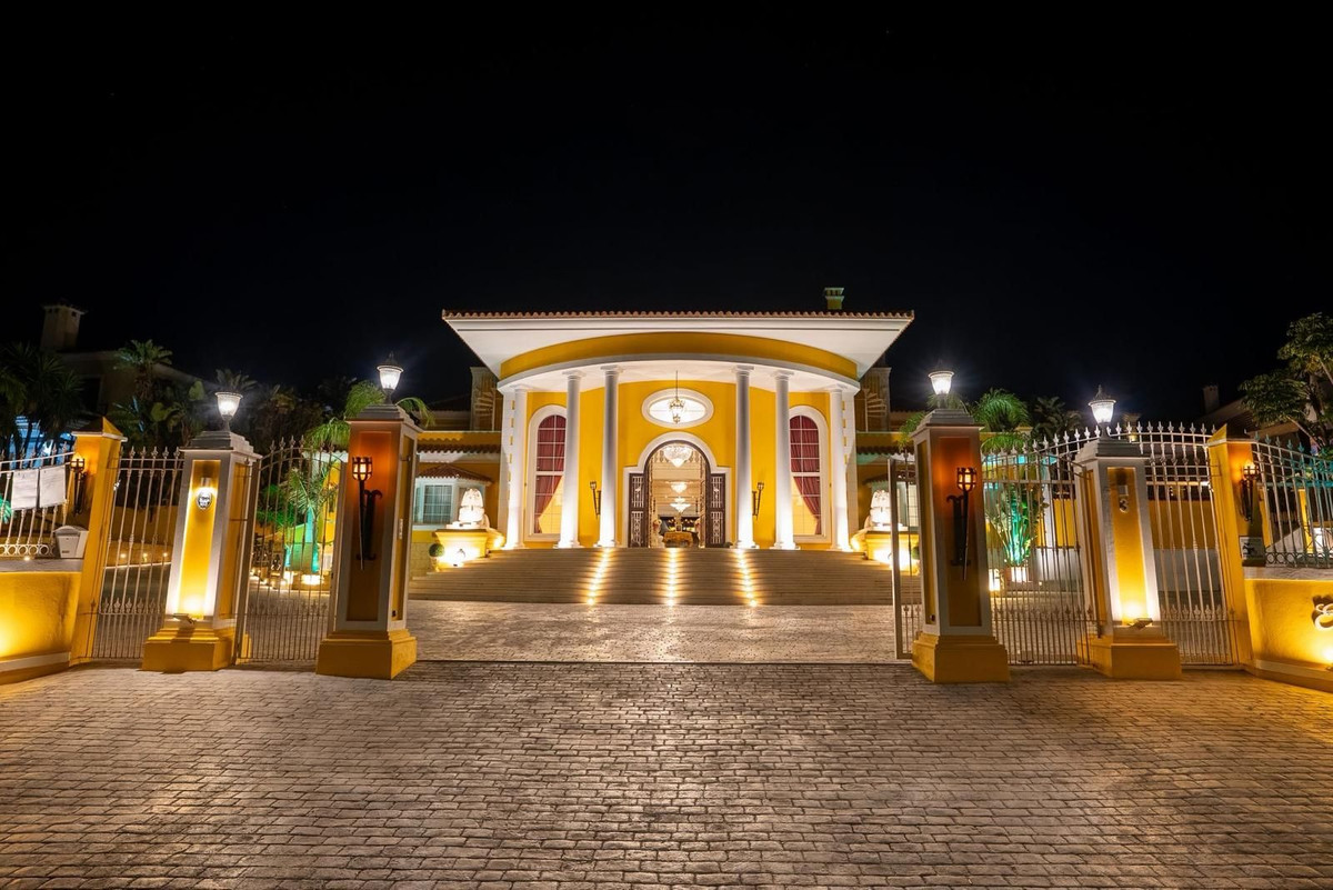 Située dans la zone G de Sotogrande Alto, cette vaste villa de luxe a été construite par son propriétaire actuel sur une période de 10 ans, avec des matériaux haut de gamme et une somptueuse sélection de lustres en cristal. Le grand hall d'entrée est orné de deux escaliers en marbre incurvés menant à l'étage supérieur, où se trouvent trois chambres, dont une suite parentale décorée sur le thème égyptien, avec des murs peints à la main, des moulures raffinées et des piliers en pierre massive. Un salon privé donne sur le jardin et la piscine. On y trouve également un dressing et une salle de bains attenante avec baignoire balnéo et double douche à l'italienne. Deux autres chambres spacieuses, chacune avec sa propre salle de bains, se trouvent à cet étage et donnent accès à la terrasse privée. De là, un escalier mène au solarium privé. Un ascenseur dessert les trois étages. Au rez-de-chaussée se trouvent un grand salon, une salle à manger et des portes donnant sur la terrasse couverte et la piscine. On y trouve également une cuisine de service avec cellier, une buanderie et un cellier. On y trouve également une salle de cinéma entièrement équipée avec huit fauteuils en cuir. Au demi-sous-sol se situe la suite de divertissement, décorée et peinte à la main sur le thème égyptien, avec une décoration assortie. Elle comprend une table de poker, des espaces de détente, un grand bar à cocktails, une salle de sport moderne avec vestiaires et douches, ainsi que deux autres chambres avec salles de bains privatives, également de style égyptien. Au centre du salon se trouve un théâtre miniature inspiré des théâtres du West End londonien, avec deux loges et 37 places. Luxueusement décoré dans un style théâtral, il est fourni avec l'ensemble des décors et accessoires nécessaires à une production de la comédie musicale « Le Fantôme de l'Opéra » et offre un système son et lumière complet, ainsi que la possibilité de projeter des films grâce au système de projection et une scène pour de petits concerts privés. Les travaux sur la villa et le terrain ne sont pas encore terminés, mais il s'agit d'une propriété unique et personnalisée, qui mérite d'être visitée par l'acheteur à la recherche d'une maison d'exception.