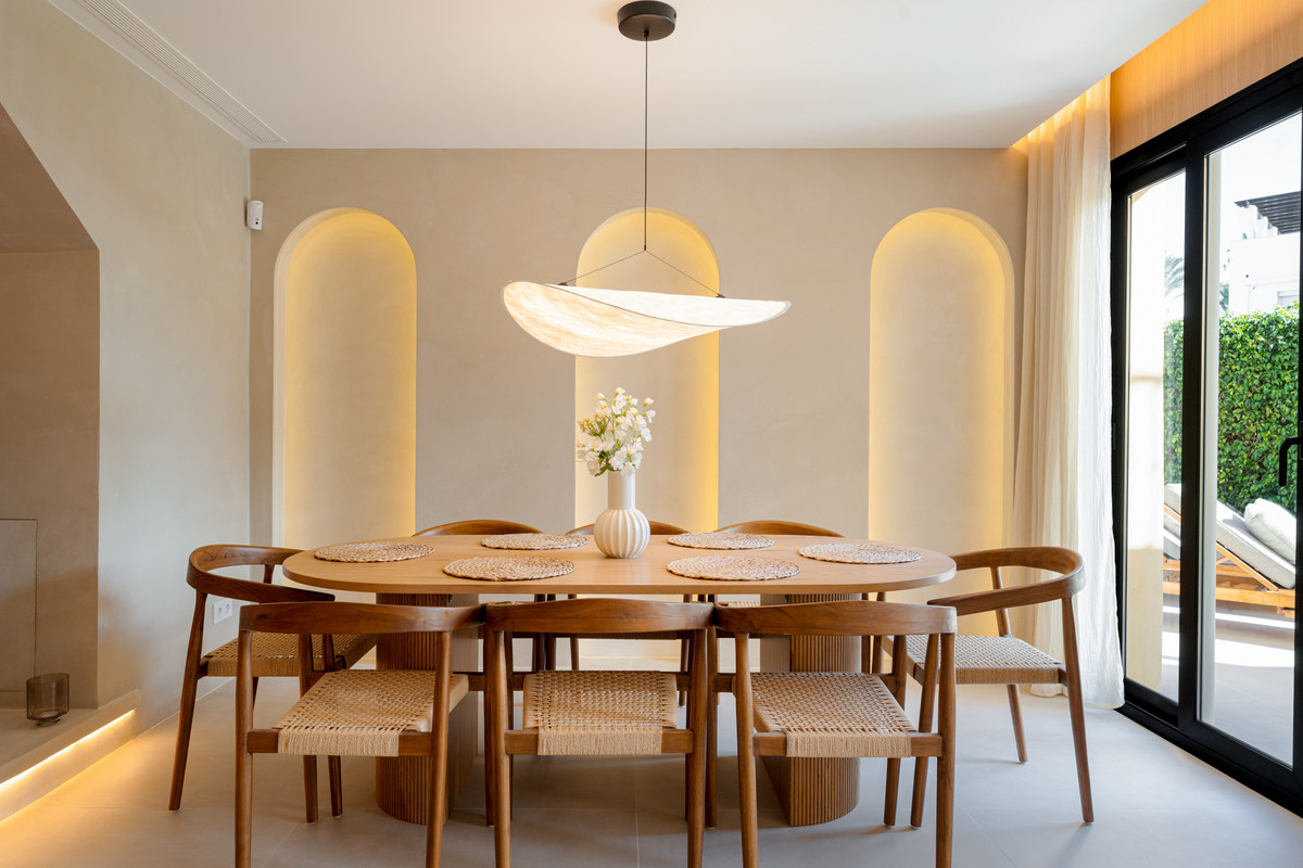The townhouse spans four bedrooms and three bathrooms, including one en-suite, a full family bathroom, and a guest toilet. Every detail of the renovation has been executed with precision and taste. The interiors feature bespoke carpentry, microcement finishes, and discreet LED lighting that creates a warm and inviting ambiance. The result is a home that feels both sophisticated and comfortable, equally suited for year-round living or as a luxurious holiday retreat.