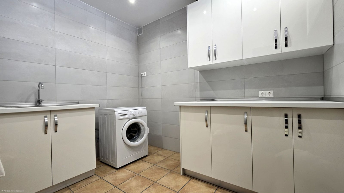 Down the short flight of stairs. To the left there ia a very large uttility room with sink, washing machine, fitted kitchen cupboards, also there is storage and a small pantree.
