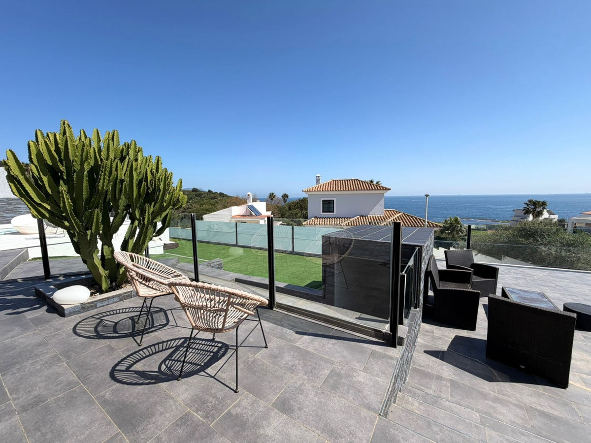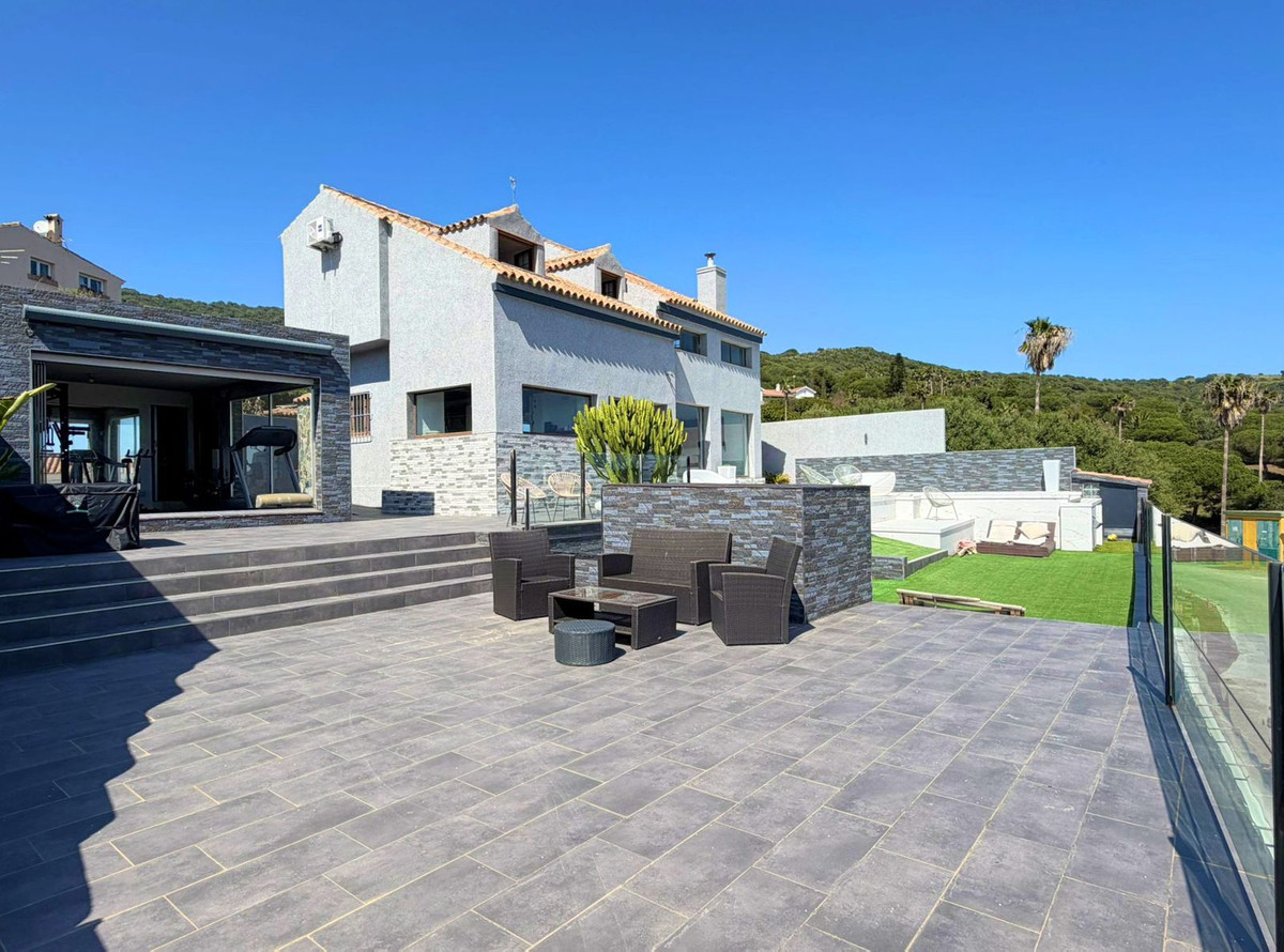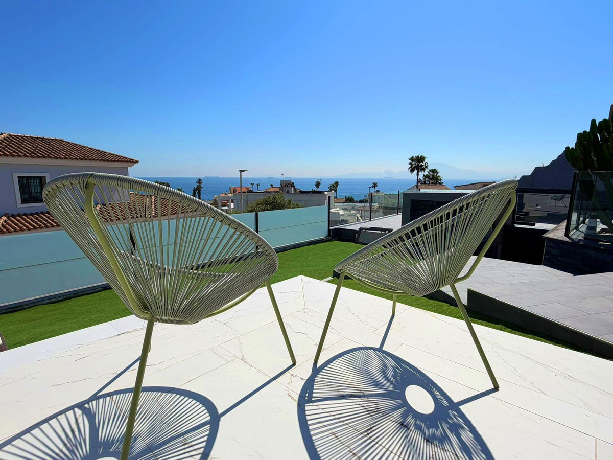 This spectacular fully renovated villa is located in the peaceful El Faro de Punta Carnero residential area, surrounded by the Los Alcornocales Natural Park and just a few meters from the sea. It’s the perfect place to enjoy nature without giving up the convenience of being close to the city. The property is laid out over two floors and stands out for its abundant natural light, thanks to large windows that fill every space with sunshine. On the main floor, you’ll find the living areas: an entrance hall leading to a spacious living-dining room with access to a terrace offering stunning views, a fully equipped kitchen with an integrated dining area, a guest toilet, and a dressing room with access to a rear patio. The upper floor houses two bedrooms and an en-suite bathroom with a whirlpool bathtub and shower. There is also an open space currently used as an office, which could easily be converted into a third bedroom. Outside, the villa features an infinity pool with an integrated jacuzzi, surrounded by a large relaxation area, and a gym with a full bathroom and shower. The enclosed garage with an automatic door has space for two vehicles. Its location allows you to enjoy nature and outdoor activities such as hiking and cycling, as well as water sports like paddleboarding or kayaking, with easy access to both the Costa del Sol and the Costa de la Luz—all just a few minutes from Algeciras.