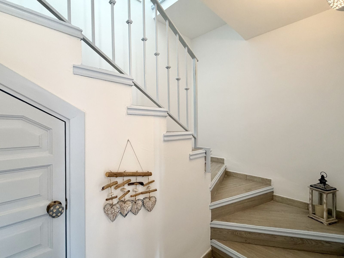Au niveau inférieur, deux chambres doubles spacieuses, chacune dotée d'une armoire intégrée et d'un accès direct à la seconde terrasse, offrent un confort optimal. Une élégante salle de bains familiale, avec douche à l'italienne et détails en pierre raffinés, apporte du cachet, tandis qu'un espace de rangement supplémentaire sous l'escalier optimise l'espace.