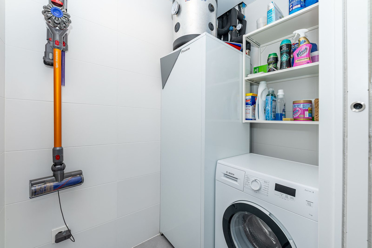 La propriété comprend trois chambres, deux salles de bains modernes avec douches, des placards intégrés et une buanderie/pièce de rangement pratique, ainsi qu'un accès aux espaces communs.