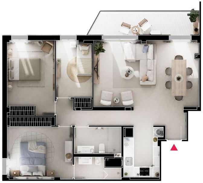3 chambres, 1 salle de bain, surface construite 79 m², terrasse 4 m².