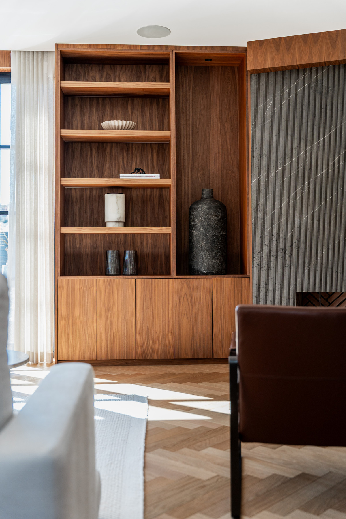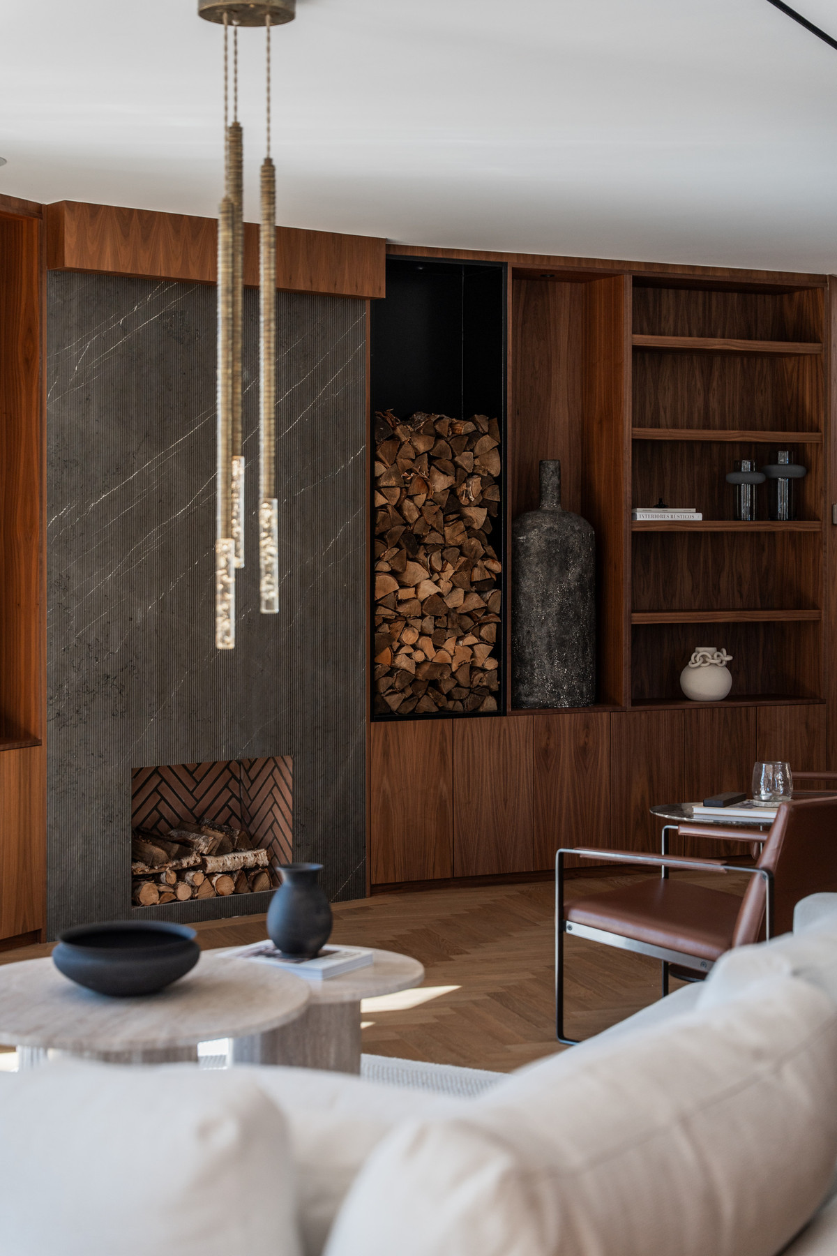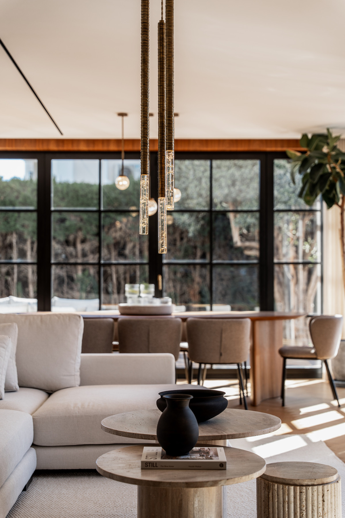 Cette villa de Golf Valley est unique en son genre. Repensée selon une vision architecturale affirmée, elle accorde une attention particulière aux proportions, aux matériaux et à la circulation. Dès l'entrée, le souci du détail saute aux yeux : parquet en chêne à chevrons, menuiseries sur mesure en noyer, meubles cannelés et marbre veiné foncé, le tout harmonieusement agencé plutôt que par un contraste ostentatoire.