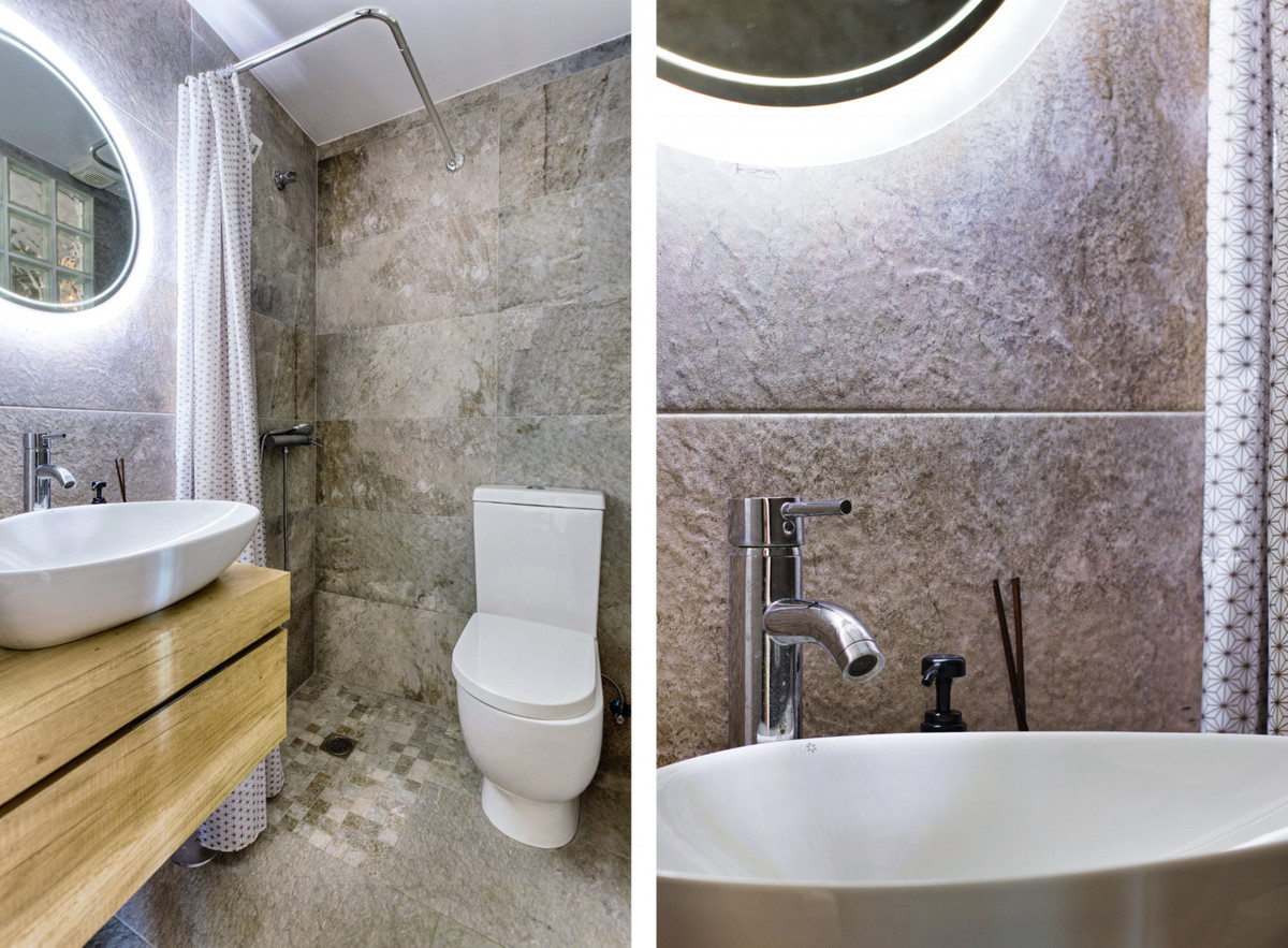 Au rez-de-chaussée se trouvent les espaces de vie. Le salon et la cuisine forment un espace ouvert. On y trouve également un dressing, une chambre et deux salles de bains. À l'étage inférieur se trouvent la suite parentale et deux chambres d'amis avec leurs salles de bains respectives. On y trouve également un appartement indépendant, doté de sa propre cuisine et salle de bains, d'une entrée et d'une terrasse privatives. Cet appartement peut être intégré au reste de la maison ou considéré comme un logement indépendant.