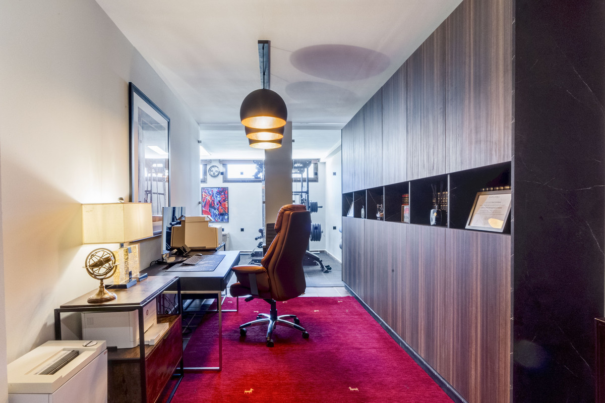 Cette villa offre une configuration impressionnante sur plusieurs niveaux. Le rez-de-chaussée comprend un salon confortable, une salle de sport, un bureau fonctionnel, une buanderie et un grand cellier. Les espaces de vie et de réception s'enchaînent harmonieusement grâce à un agencement ouvert salon-salle à manger, mis en valeur par une cuisine moderne et entièrement équipée. La villa bénéficie de la climatisation et d'une cheminée, garantissant un confort optimal en toute saison. La lumière naturelle baigne les intérieurs grâce à leur orientation sud-ouest, tandis que plusieurs terrasses et un solarium offrent de vastes espaces de détente et de repas en plein air. La terrasse privée est un atout majeur, offrant une vue imprenable sur le lac, les jardins luxuriants et un panorama exceptionnel.
