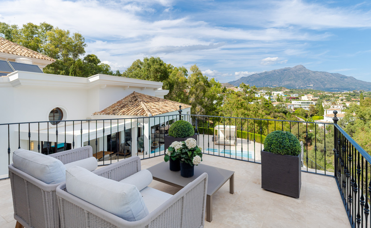 community of El Herrojo Alto, and due to its elevated secluded position it offers breath-taking views over its own private estate of more than 10,000m2 and towards the panoramic view of the Mediterranean sea and Marbella’s striking La Concha mountain.