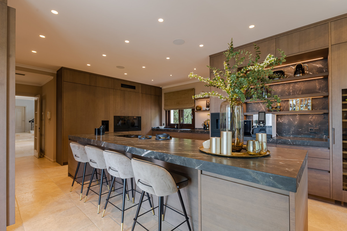 On the lower level of this villa you will find the magnificent cinema room with its elegant bar, a fully equipped gym, sauna, private office, two further guest bedrooms with en-suite bathrooms and finally the garage for at least 4 cars. These are just some of the features that this fabulous family home has to offer so whether you’re looking to relax and enjoy the stunning views or indulge in luxurious amenities, this villa has something for everyone.