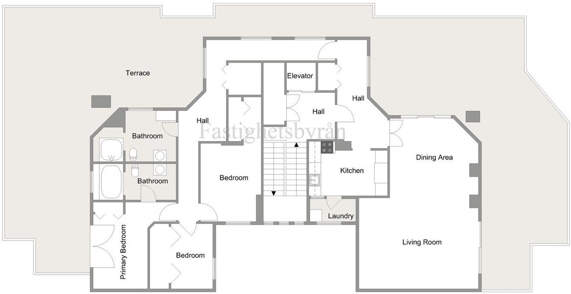 Cet appartement bénéficie d'une distribution bien pensée et de généreux espaces de vie. La cuisine est entièrement équipée et complétée par une buanderie séparée. Le bien comprend trois chambres avec placards intégrés et deux salles de bains, dont une attenante. La chambre principale donne directement sur la terrasse.