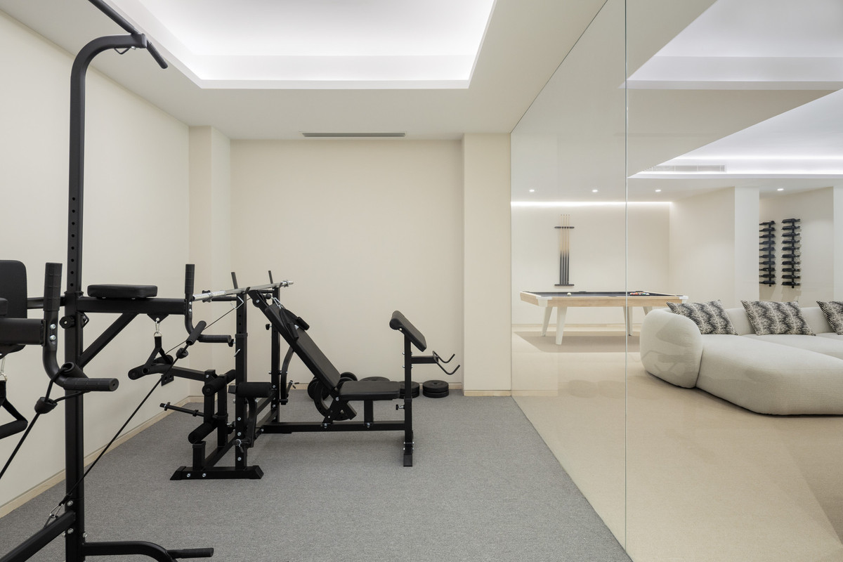 The lower level is designed for leisure and functionality, featuring a fully equipped gym, a bespoke bodega, a second living room, and an additional kitchen with bar area. This level also includes two en-suite guest bedrooms, both with direct access to a secondary pool area and landscaped gardens, creating a private retreat for guests. A three-car garage and guest toilet complete this floor.