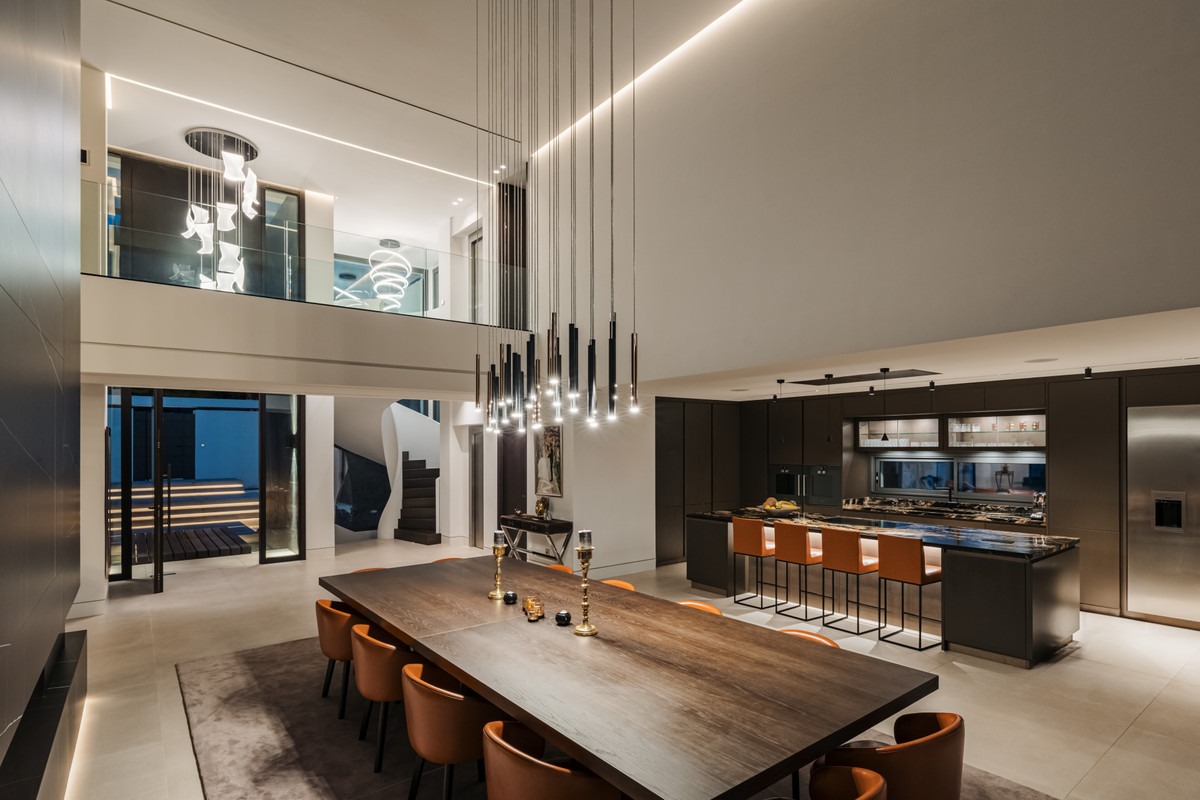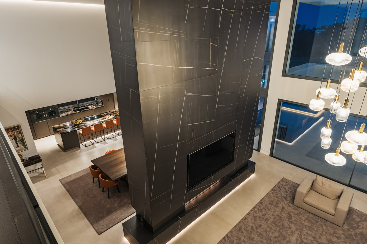 The villa features a fully equipped, contemporary kitchen seamlessly connected to a spacious dining area. Both areas, along with the luminous living room, enjoy abundant natural light streaming through large glass doors, creating a harmonious and well-defined layout. A stylish fireplace adds warmth and charm to the space. Designed for ultimate convenience, the home also boasts a basement with a private sauna, indoor pool, gym, solarium, and cinema room—your personal retreat for entertainment and wellness.
