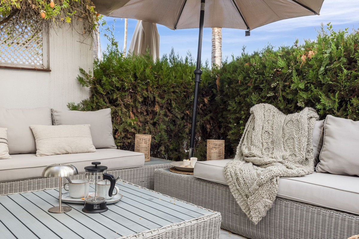 L'espace de vie comprend un canapé confortable et des fauteuils, et s'ouvre sur une charmante terrasse où vous pourrez prendre un dîner ou un verre entre amis ou en famille.
