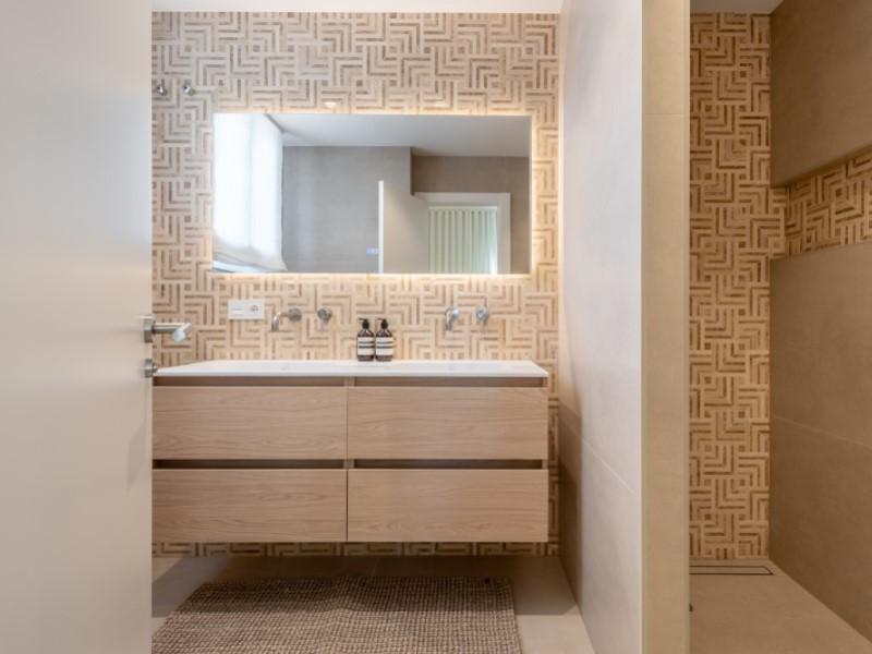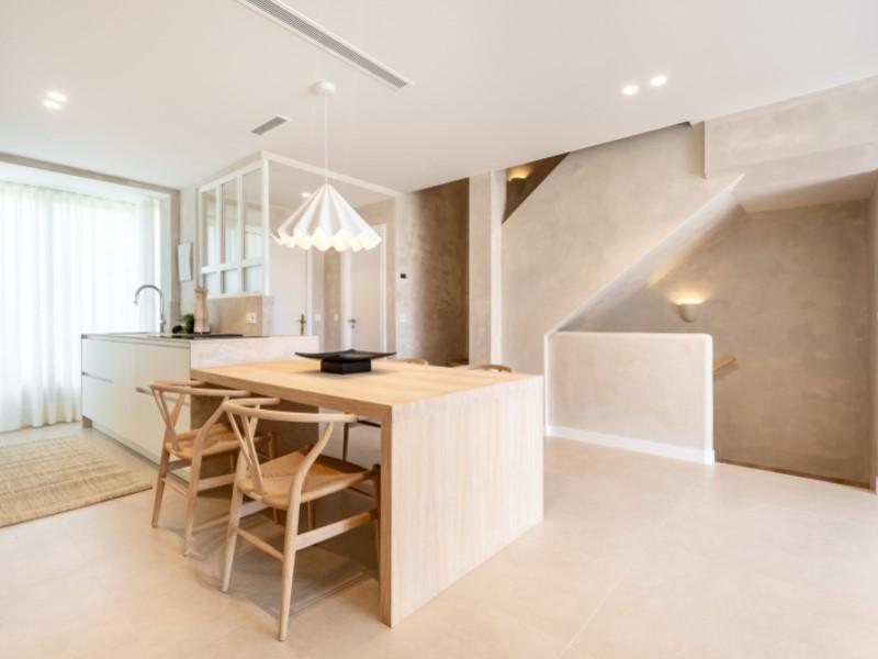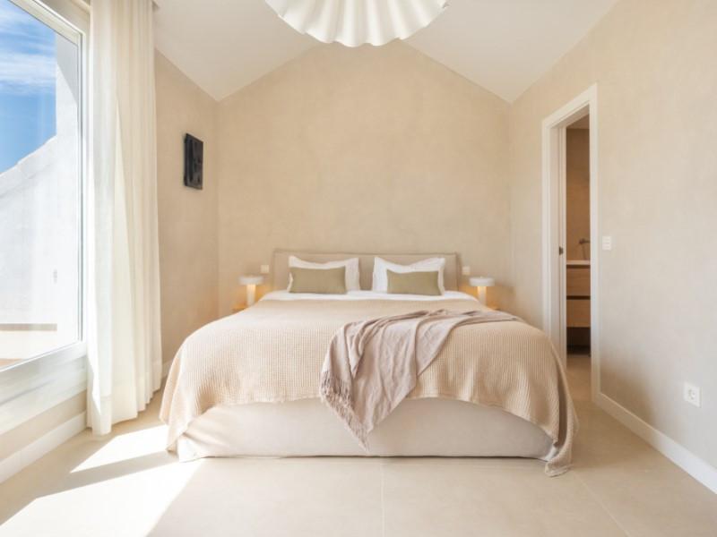 Trois chambres spacieuses et trois salles de bains complètes aux étages supérieurs offrent une intimité optimale à la famille et aux invités. Finitions haut de gamme, placards sur mesure et volets Mallorquina emblématiques qui filtrent la lumière du soleil et isolent du monde extérieur la nuit.