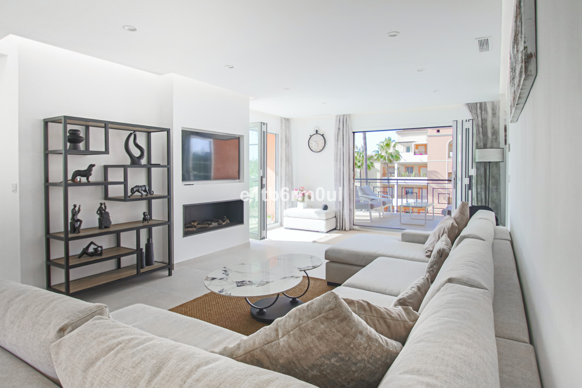 Appartement de deux chambres et deux salles de bains entièrement rénové, situé dans la résidence prisée Urb. River Garden, à Nueva Andalucia, quartier très apprécié des golfeurs car au cœur de la vallée golfique de la Costa del Sol. Ce petit ensemble résidentiel, bien entretenu et arboré, dispose d'une piscine commune. Accès facile à Puerto Banús et Marbella. L'appartement a été entièrement rénové en 2025, offrant une esthétique à la fois moderne et chaleureuse. La cuisine ouverte sur le séjour et la salle à manger est spacieuse et lumineuse, donnant sur une grande terrasse couverte avec vue sur la piscine, idéale pour se détendre ou dîner en plein air. La chambre principale possède sa propre salle de bains, et la chambre d'amis dispose d'une salle de bains séparée. Le bien comprend également une place de parking en sous-sol et un cellier.
