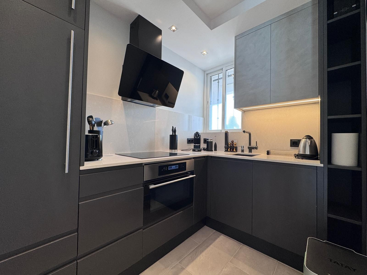 Hall d'entrée, cuisine, salle de bains, chambre, salon et terrasse avec vue sur la mer.