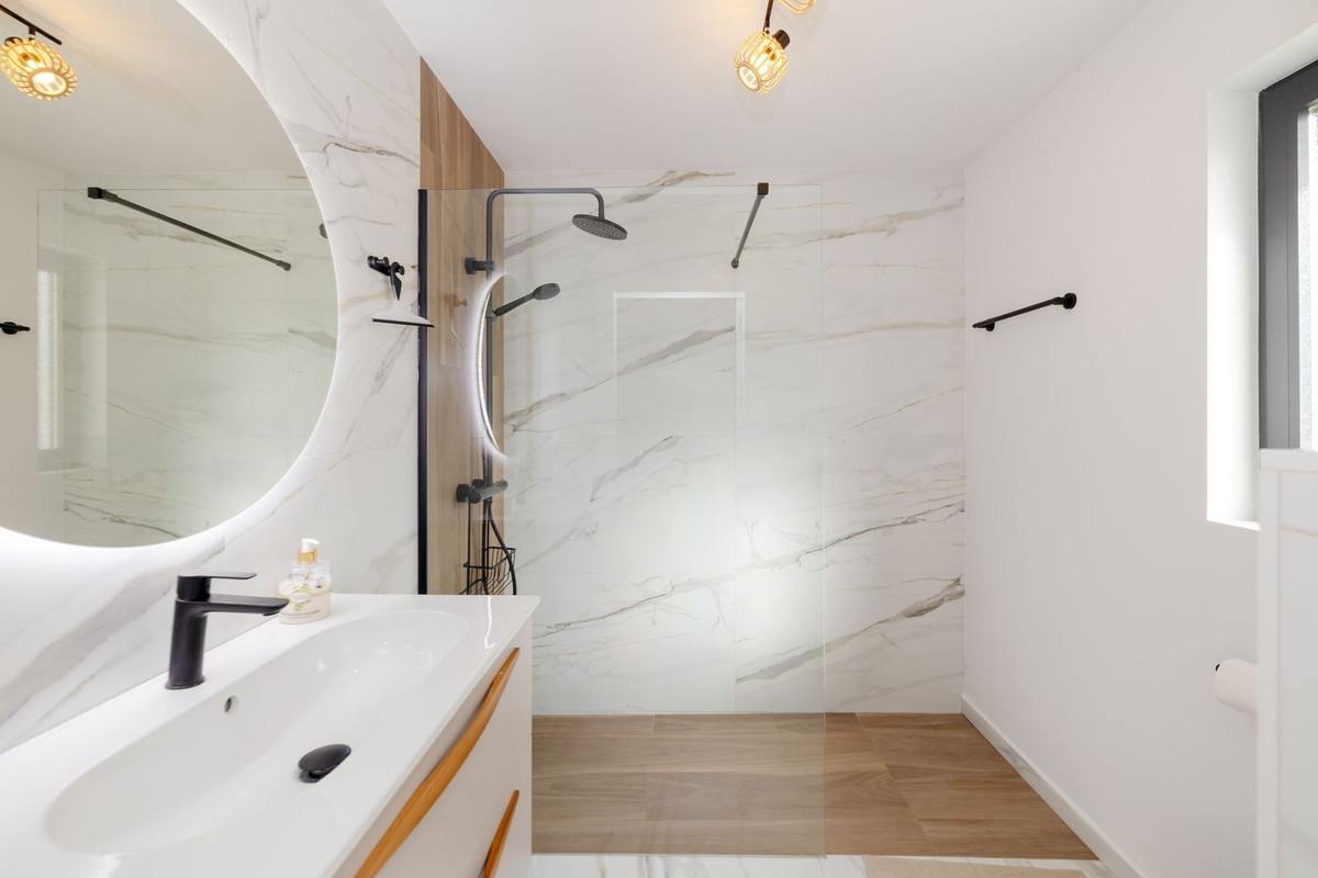 Cette propriété de plain-pied comprend six chambres spacieuses et six salles de bains, garantissant confort et accessibilité. Son orientation plein sud assure une luminosité naturelle optimale tout au long de la journée et une température agréable. Parmi ses atouts, on note des finitions haut de gamme, telles que des menuiseries intérieures en aluminium et des fenêtres extérieures CLIMALIT, assurant isolation et confort. De plus, elle est équipée d'appareils électroménagers Siemens haut de gamme, de la climatisation, de la domotique, d'un système d'alarme et d'un chauffage solaire, ce qui en fait une maison moderne et performante.