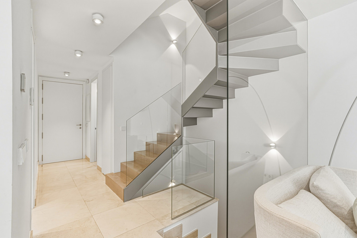Le rez-de-chaussée comprend un espace de vie lumineux et ouvert avec cuisine moderne entièrement équipée, donnant sur un jardin privatif avec accès direct à la piscine commune, créant ainsi un cadre de vie idéal entre intérieur et extérieur. Ce niveau inclut également une chambre d'amis et une salle de bain complète. Au premier étage, la propriété offre une spacieuse suite parentale avec terrasse privative, deux chambres d'amis supplémentaires et une élégante salle de bain commune. Le niveau supérieur mène à un généreux solarium privatif, agrémenté d'un espace barbecue et d'un bassin, idéal pour se détendre ou recevoir. Le niveau inférieur comprend une grande pièce polyvalente, parfaite pour une salle de sport ou une salle de jeux, ainsi qu'une buanderie, un espace de rangement et un accès direct au garage. Parmi les autres prestations, citons la climatisation réversible, deux places de parking privatives et un service de conciergerie. Cette propriété offre une combinaison parfaite de design contemporain, de confort et d'un emplacement privilégié.